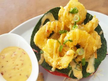 Lightly battered pacific white shrimps, fried corn tortilla, cabbage slaw, mayo-sweet chili sauce
