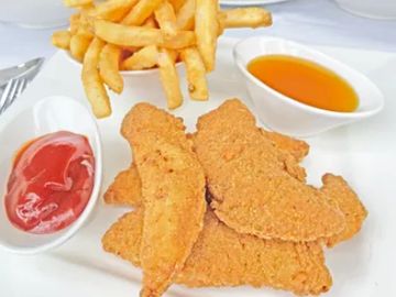 Golden fried chicken breast strips, honey Dijon sauce, French fries