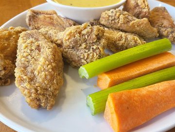 One-pound of chicken wings, carrot and celery sticks, dill pickle ranch dip, choice of red hot buffalo, smokey barbecue or honey Dijon