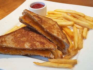 White bread, cheddar cheese, fries or salad
