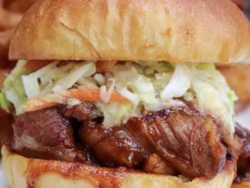 48 hours smoked and slow cooked beef brisket, barbecue sauce, fried onions, apple cider slaw