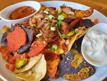 Tri-color tortilla chips, four-cheese blend, jalapeño, green onions, tomatoes, sour cream, tomato salsa