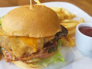 6 oz brisket and chuck patty, cheddar, Crave sauce, bacon, lettuce, tomato, onion, pickles, potato bun