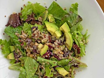 Organic greens, tri-color quinoa grains, chickpeas, sunflower seeds, pumpkin seeds, Bala cranberries, toasted walnuts, red onion, bell peppers, avocado, white balsamic-apple cider vinaigrette