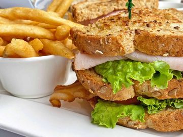 Smoked turkey, bacon, lettuce, tomato, Crave sauce on multigrain panini